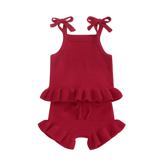 Baby Girl 2Pcs Outfits Knit Solid Color Sleeveless Cami Tank Top Tie with Elastic Waist Shorts Outfit Set