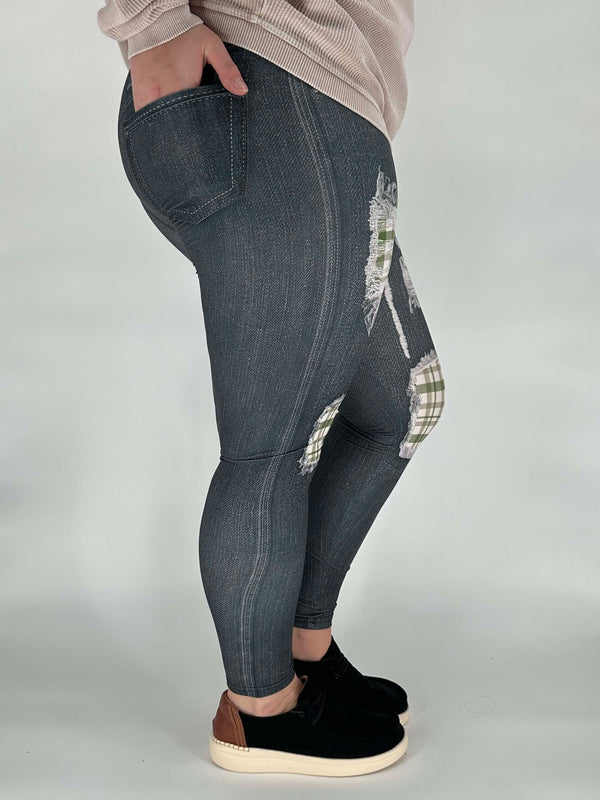 Christmas Plaid Blue Denim Leggings w/ Back Pockets