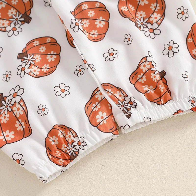 Baby Girls 3Pcs Halloween Outfit Ribbed Long Sleeve Frill Sleeve Romper and Elastic Pumpkin Flower Print Pants Headband Set