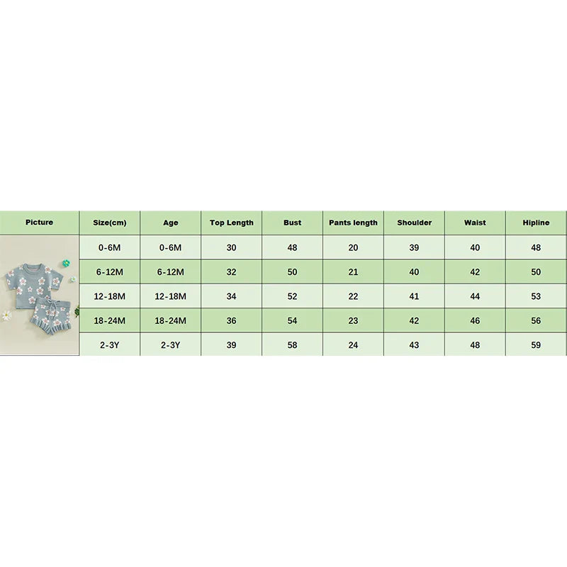 0-6M Tops Length: 11.81 Bust: 18.90 Sleeve: 3.54 Shoulder: 15.35 Waist: 15.75 Shorts Length: 7.87 Hip: 18.90 Advised Age: 0-6 Months